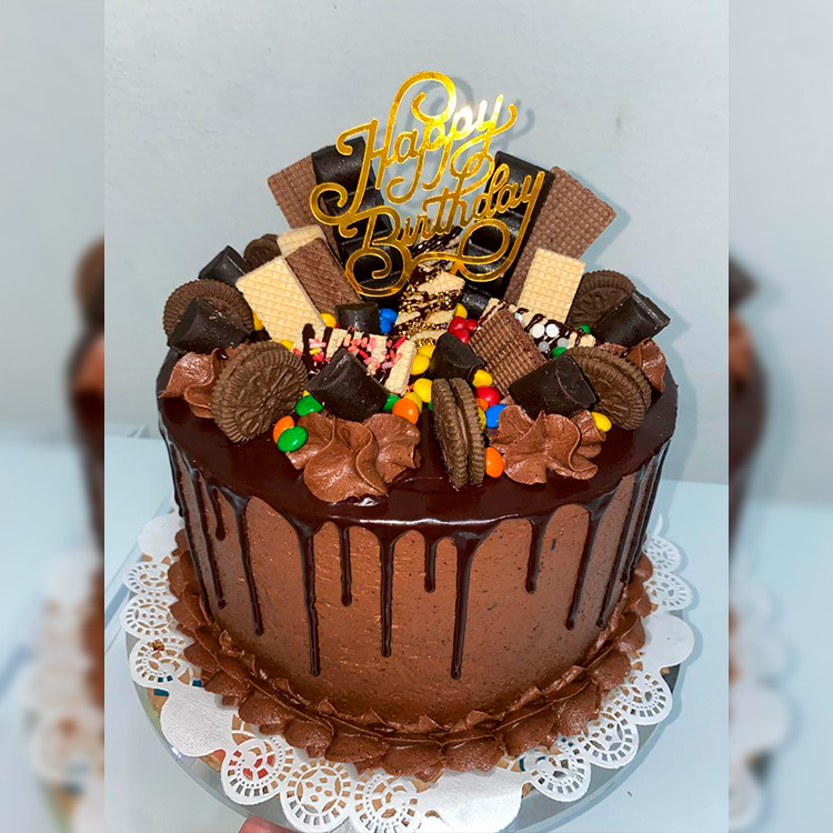 Consta de 4 masas sabor chocolate y 3 rellenos de crema bombón, recubierta con crema bombón de mantequilla y decorada con chocolate fundido y confituras surtidas